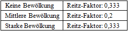 Diffusstrahlungsfaktor (Reitz) Der Diffusstrahlungsfaktor (Reitz) gibt den Prozentsatz der Sonnenstrahlung an, der durch Streuungseffekte in der Atmosphäre “verloren” geht und die Erdoberfläche als diffuse Himmelsstrahlung erreicht. Als Anteil kann der Wert des Reitz-Faktors nur zwischen 0,0 und 1,0 liegen. Bei vollständigem, mit dunklen Gewitterwolken bedecktem Himmel kann der Reitz-Faktor Werte unter 0,1 annehmen; es ist fast dunkel. Bei hochnebelartiger Bewölkung kann der Reitz-Faktor bis auf über 0,8 ansteigen; trotz fehlender Direkt-strahlung ist es sehr hell.